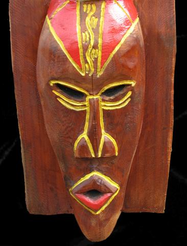 Masks from around the world adorn this totem. Approximately 7'